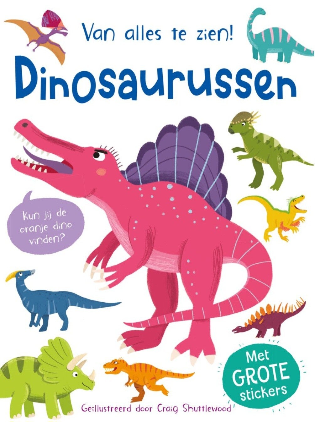 Vrolijk zoekboek met prachtig geïllustreerde platen en grote herbruikbare dinostickers.