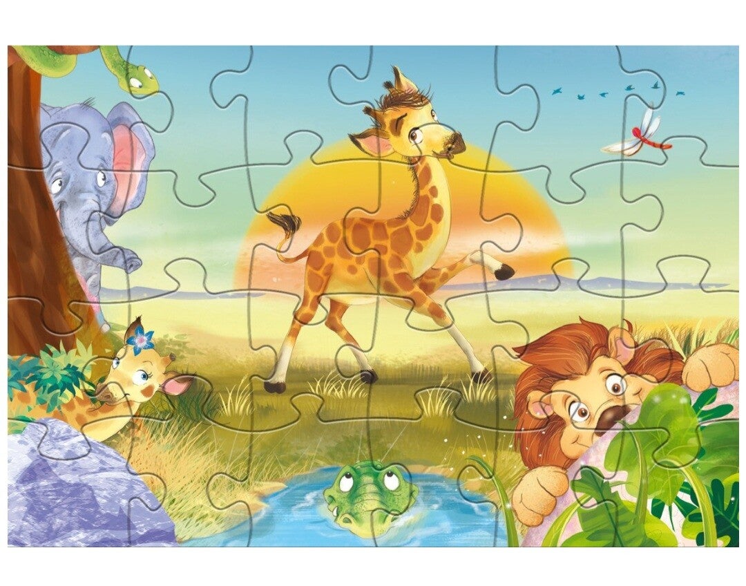 Met deze superleuke legpuzzel van Rebo Productions heeft jouw kind veel speelplezier. Leg de twee puzzels in elkaar en op beide puzzels komt er een leuke giraffe tevoorschijn! Puzzelen is niet alleen leuk maar ook erg goed voor kinderen. Ze ontwikkelen een betere hand-oog coördinatie door te kijken naar de puzzel en het goede stukje daarin te plaatsen. Ook wordt de fijne motoriek gestimuleerd. De puzzel is gemaakt van stevig karton, wat het puzzelen een stuk makkelijker maakt.